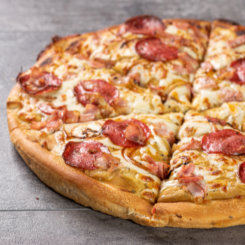 z sosem pomidorowym, mozzarellą, salami pepperoni, pieczarkami, boczkiem i pomidorem